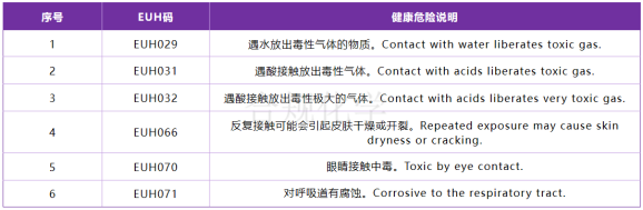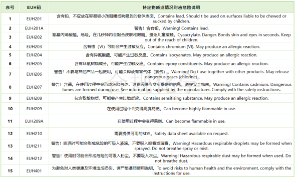 EUH碼是歐盟獨有的一類附加危害分類代碼,總共有33種,其中藍表為物理附加危害EUH碼;紫表為健康附加危害EUH碼;綠表為特定物質或情況對應的EUH碼;橙色表格為GLP法規最新修訂版中新增加的8種EUH碼。