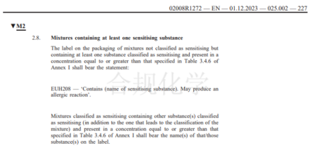 針對致敏危害和EUH208分類的共存情況,分類說明中也有相關內容要求,明確混合物在含有致敏成分,且未分類為H317或H334的情況下,如該致敏物質含量滿足EUH208的分類閾值,則標簽要素上需要體現相關危害分類,并且需要將對應致敏物質的組分名稱標注在危險性說明中,例如“包含致敏物質(鎳),可能會產生過敏反應。”
