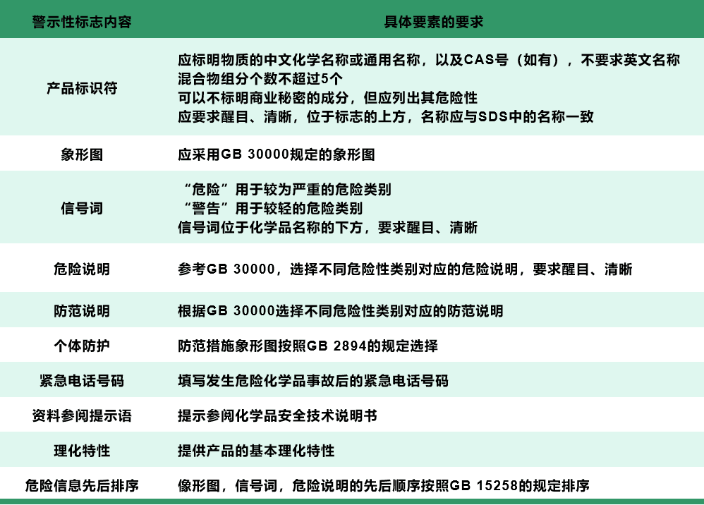 對警示性標志要素要求包括產品標識符、象形圖、信號詞、危險說明、理化特性、防范說明、防范措施象形圖、資料參閱提示語以及緊急電話號碼等。